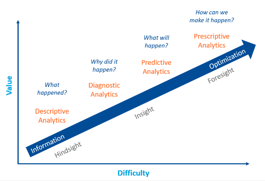 The road to analytics maturity usually begins with descriptive analytics and then moves to diagnostic, predictive, and ultimately prescriptive analytics.